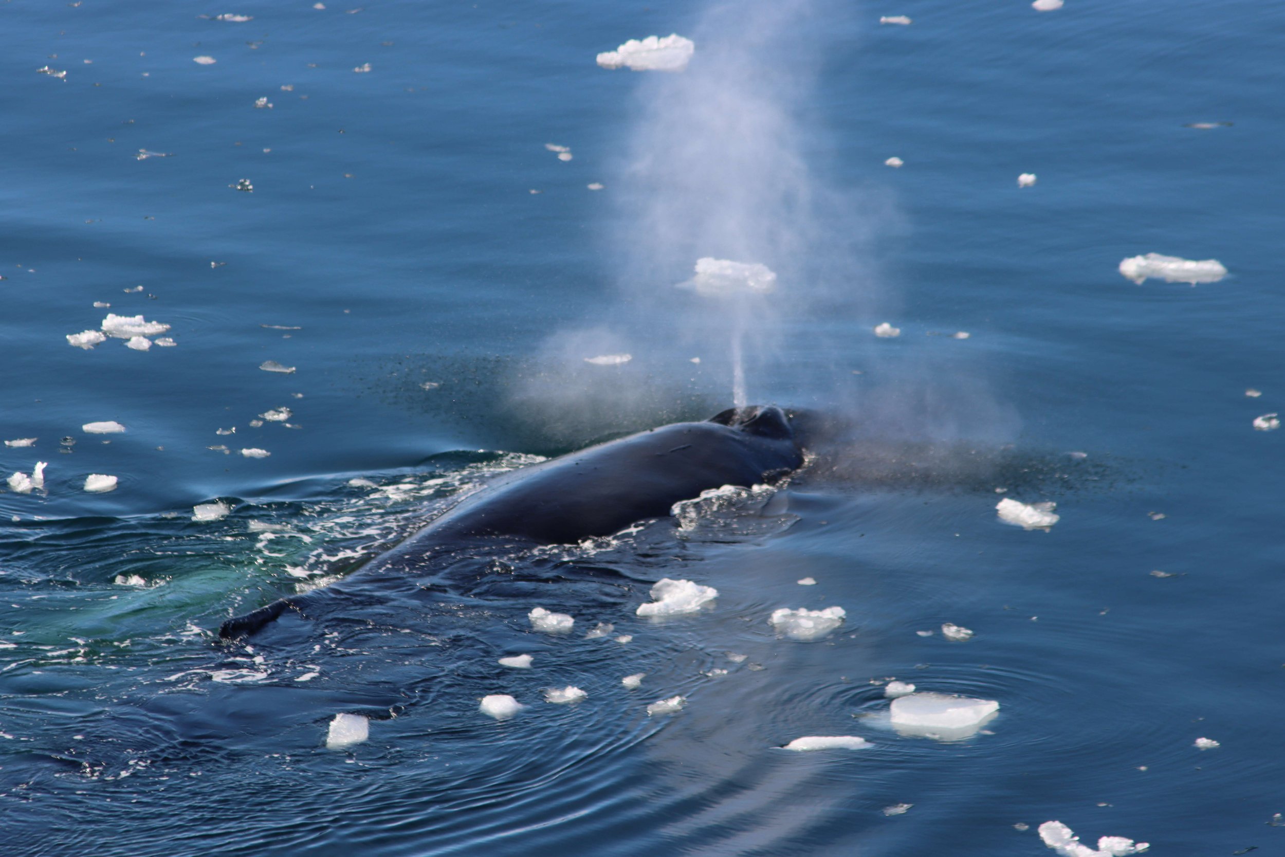 As we cruise the fog clears and the sun shines, coating the icebergs in a glossy sheen, illuminating the water and turning the bases and crevasses a translucent shade of blue. Todd manouevres the Zodiac through an ever-thickening field of ice as we make our way back to the ship. Everyone’s smiling as they head to lunch on a communal Antarctic high. But the show isn’t over yet. For dessert there’s a trio of humpback whales bubbling and circling as they stir up a banquet of krill, blowing sprays of water into the air. Seeing these giants of the water up close and personal in their natural environment is a true privilege and has capped off the day perfectly.