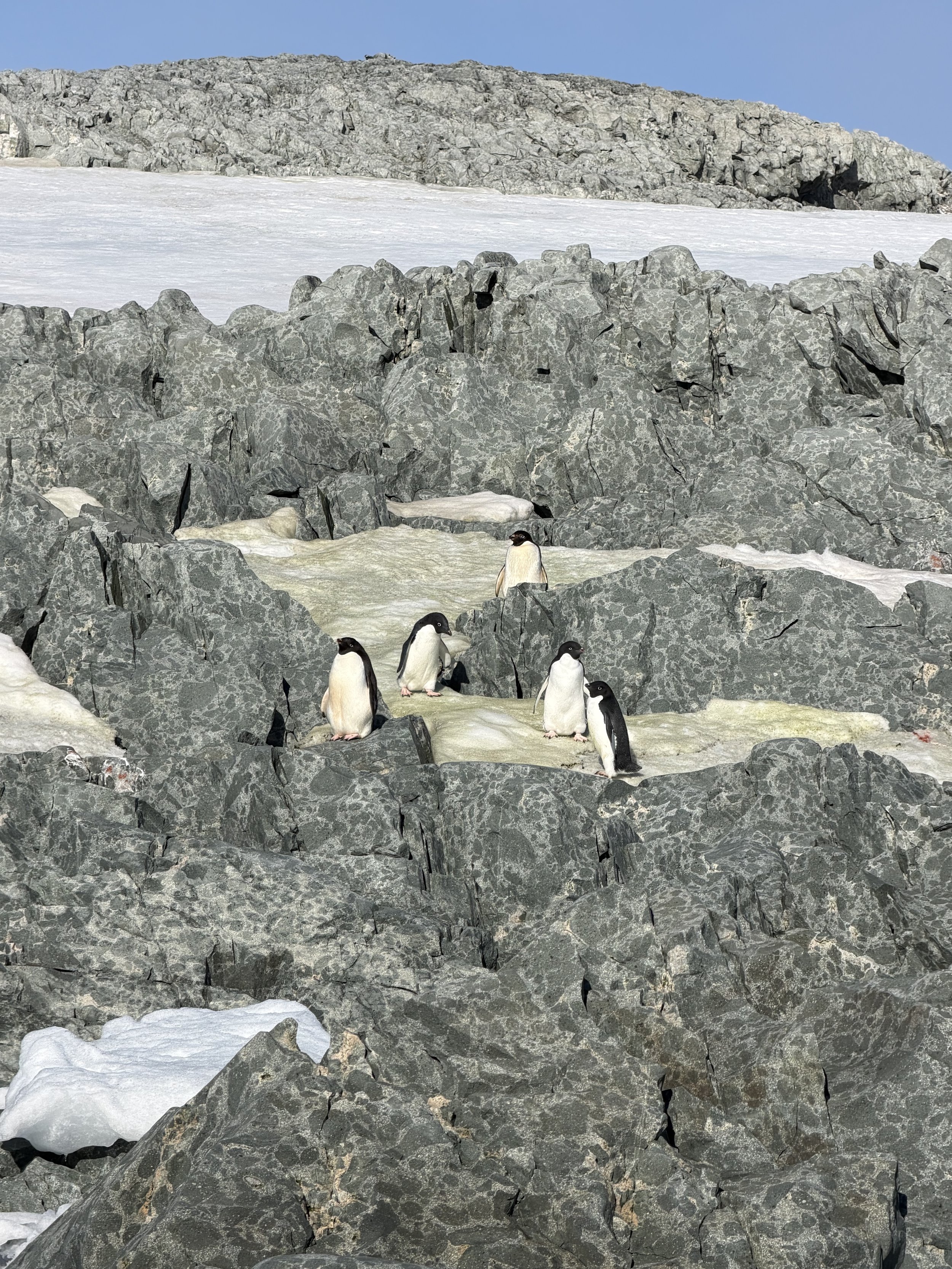 Our guide, Todd (from the UK) steers us straight to a group of Adelie penguins, biding their time as they finish moulting and prepare to dive back into the water where they’ll spend the next six months swimming and feasting, and hopefully avoiding tiger seals who also want to fatten up. The penguins still here have already survived the seals and the skuas—gull-like birds almost as big as an adult penguin who ravage their nests and feed on the babies, and sometimes the adults. Fingers crossed luck will hold out for these guys who, if they manage to keep avoiding predators, can live for up to fifteen years.