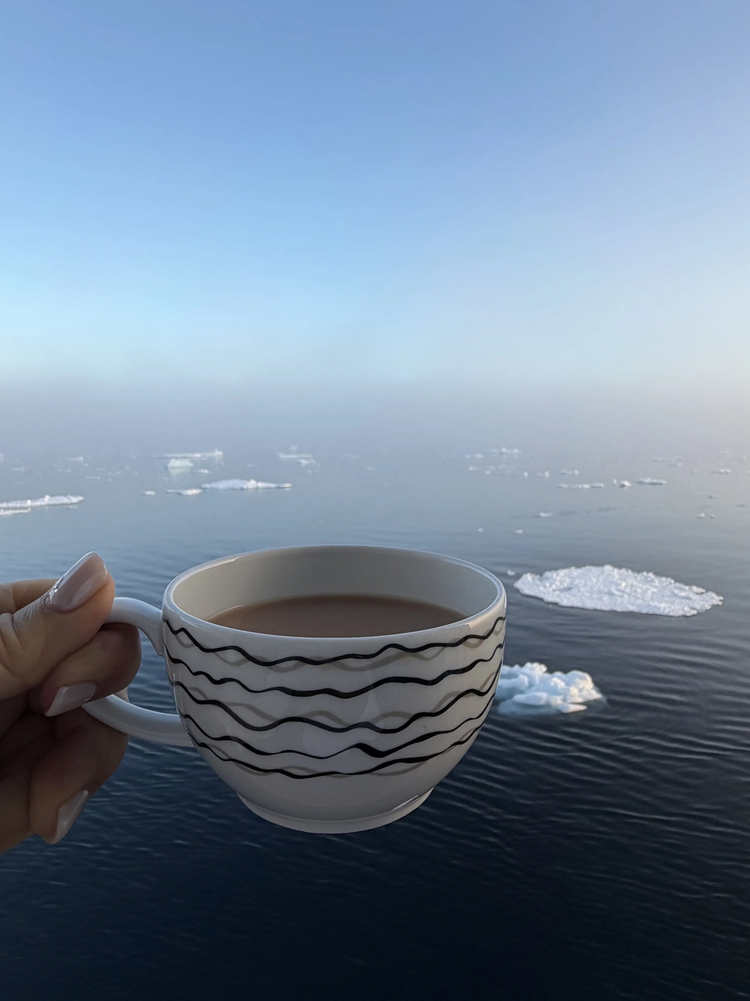 I’m looking out my cabin window at a mountain range of crystalline white, flanked by a rippling grey-blue sea dotted with islands of ice. The iceberg we’re currently cruising past looks like a giant scoop of snowy vanilla gelato, its edges sharp and crisp against a cornflower sky.