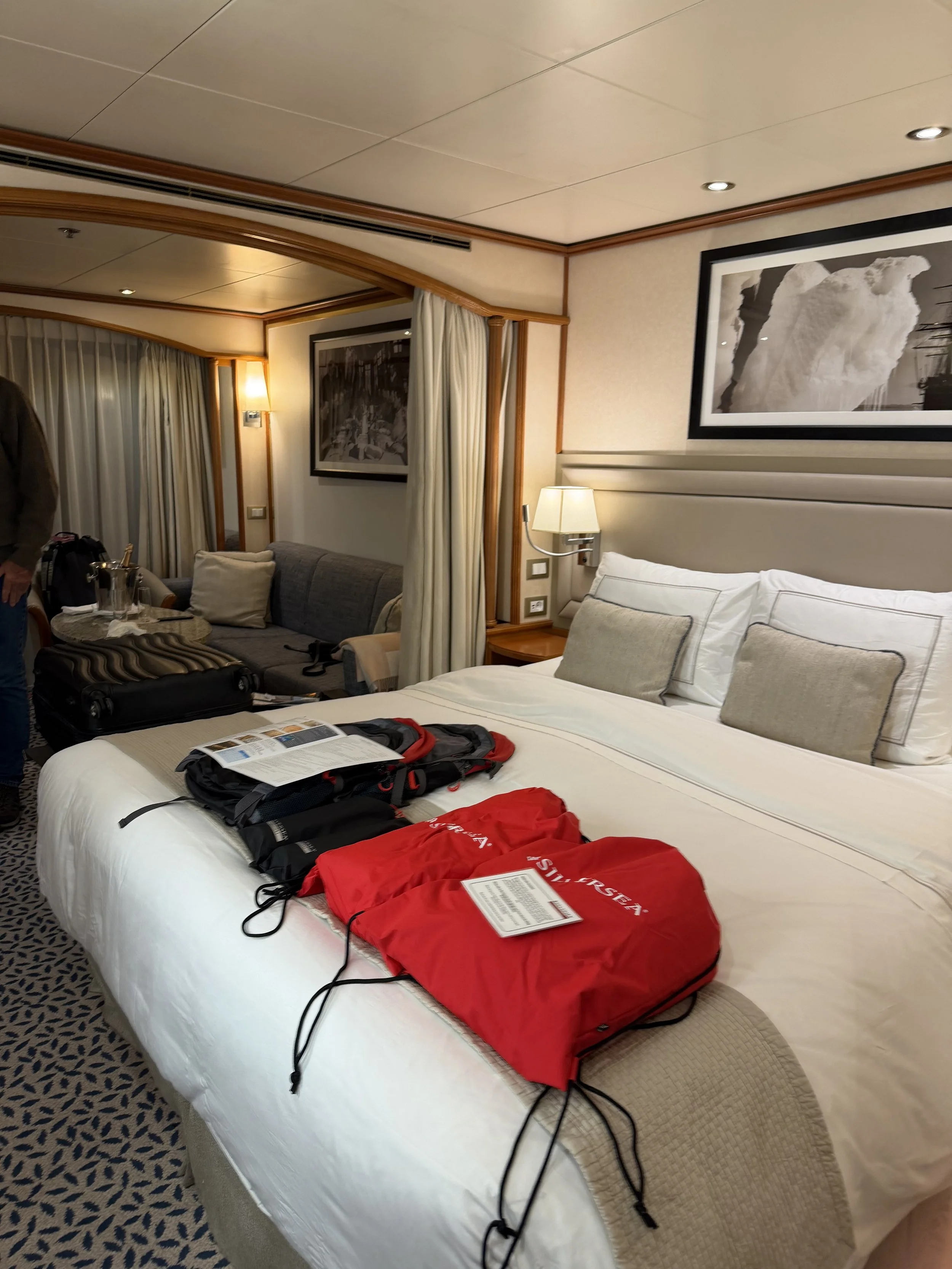 And there she was, Silver Wind, lit up and sparkling against the black night sky. We clambered up the gangplank and went through the various registration stations before heading to our room. As a cruise virgin I had no idea how large—or small— the cabin would be but I was relieved to find it generously proportioned with a walk-in wardrobe, shiny bathroom, comfy bed and a living area complete with tea and coffee making facilities and a small balcony I hope to breakfast on once we reach the Antarctic in another 36 hours.